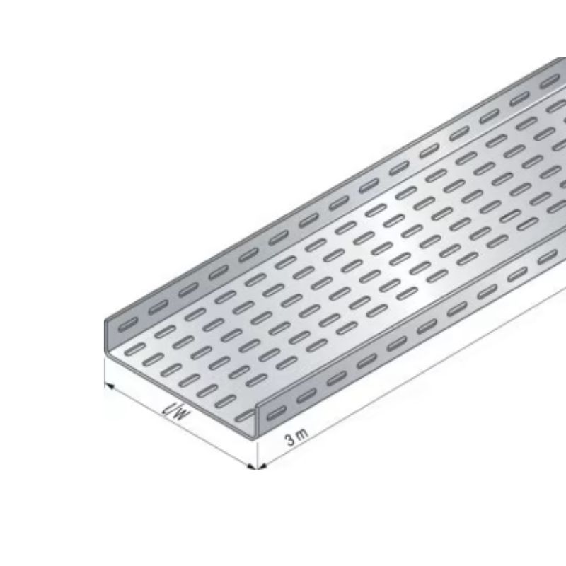 Chemin de câbles en tôle avec perforations oblongs 7x25 mm. Matériau : Acier galvanisé en continu, procédé Sendzimir